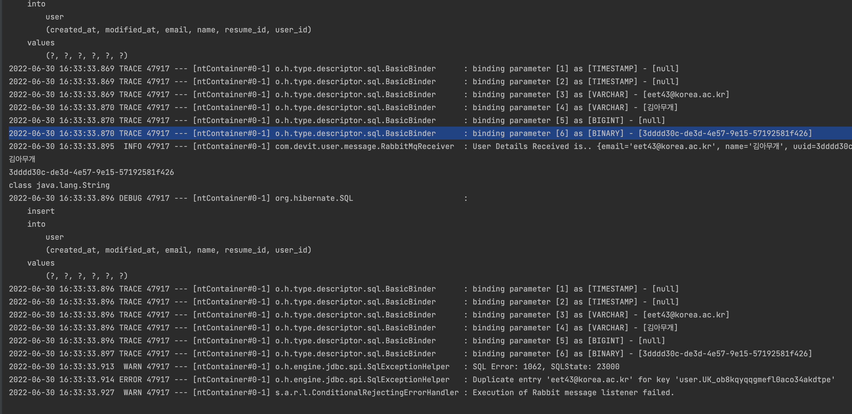 null 값이 들어가면 안됐기 때문에 예외처리가 발생하여, 메시지를 다시 큐에다 넣고, 그 후에는 무한 루프에 빠진 것이다 ..